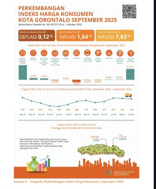 Sementara rata-rata nasional meningkat menjadi 2,65 persen pada September 2025, naik dari 2,31 persen pada Agustus, mencapai level tertinggi sejak Mei 2024. Kenaikan ini didorong terutama oleh harga makanan, yang naik dengan laju tercepat dalam 16 bulan. “Kalau melihat data yang dirilis BPS, maka inflasi Kota Gorontalo tergolong aman,” ungkap Kaima.