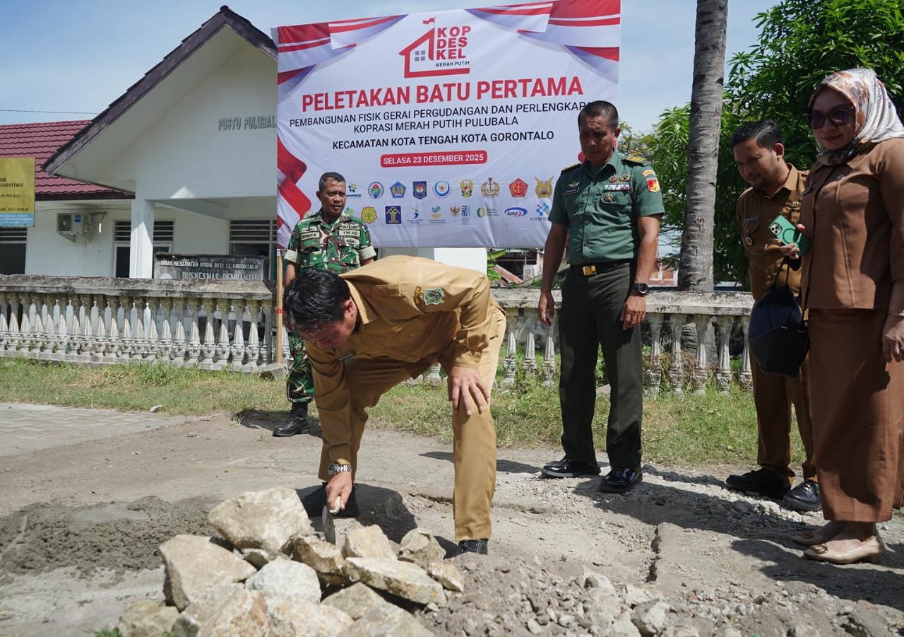 3MEDIA, GORONTALO – Koperasi Merah Putih (KMP) Kelurahan Pulubala segera memiliki gerai pergudangan dan perlengkapan. Ini setelah pembangunan gerai tersebut mulai dilaksanakan yang ditandai dengan peletakan batu pertama oleh Wali Kota Gorontalo, Adhan Dambea yang diwakili Asisten I Setda Kota Gorontalo, Iskandar Moerad, Selasa (23/12/2025).