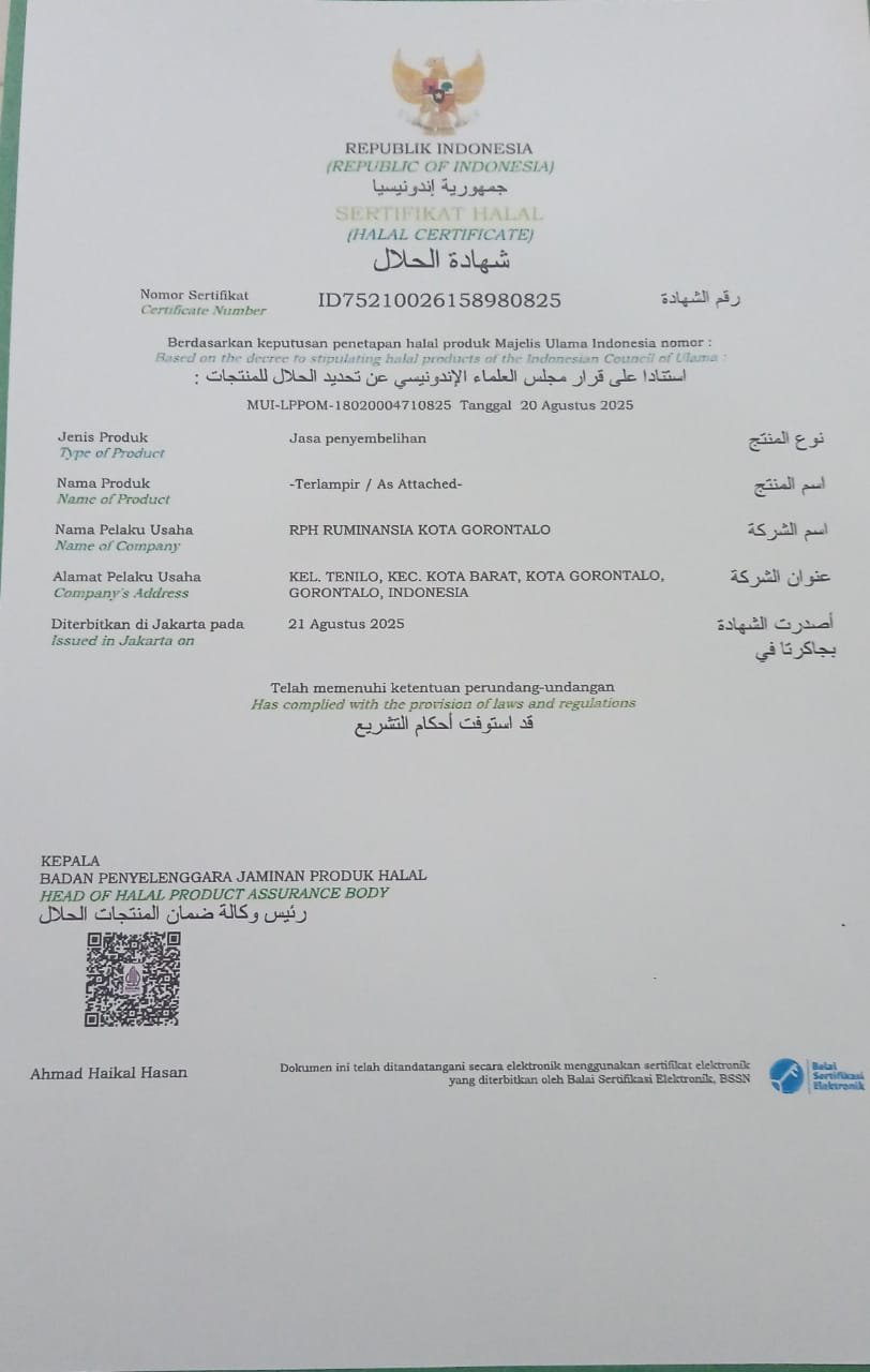 3MEDIA, GORONTALO – Unit Pelaksana Teknis Daerah (UPTD) rumah potong hewan (RPH) Ruminansia Kota Gorontalo kini mengantongi sertifikat halal yang diterbitkan oleh Badan Penyelenggara Jaminan Produk Halal (BPJH). “Alhamdulillah, dengan penuh rasa syukur, kami telah menerima sertifikat halal untuk UPTD rumah potong hewan Ruminasia,” kata pelaksana tugas (Plt) Kepala Dinas Kelautan, Perikanan dan Pertanian Kota Gorontalo, Eladona Oktamina Sidiki, Jumat (12/9/2025).